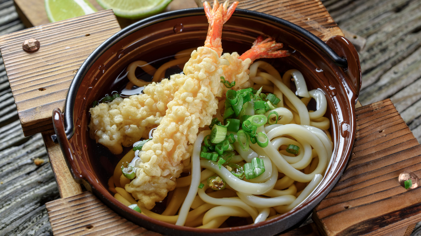 Udon noodles are thick, chewy, and made fresh every day in many chains. The texture is completely different from Western pasta and very satisfying.